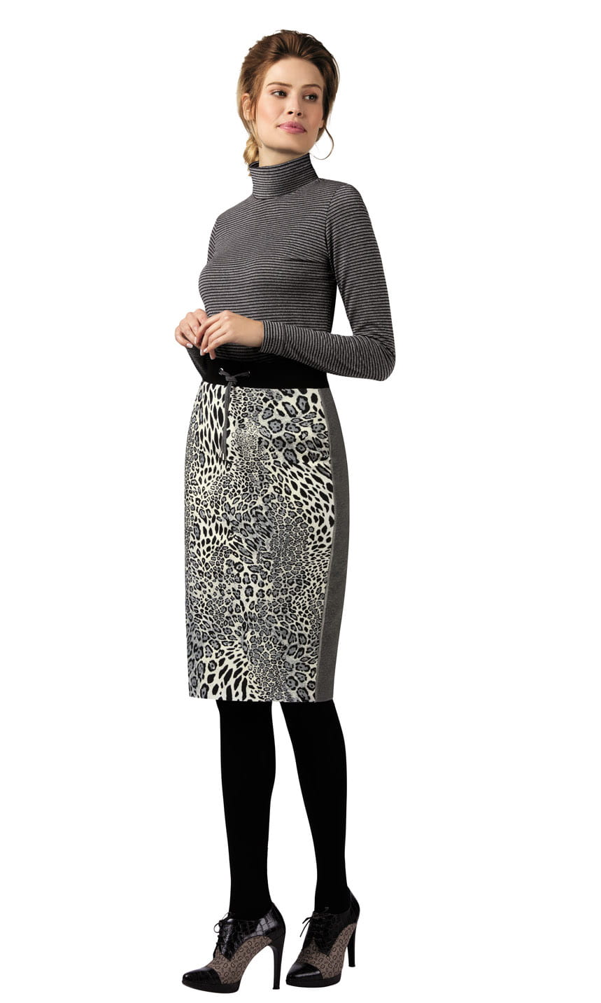 Pas wykonany z czarnej, ściągaczowej dziany, z wciągniętym szarym troczkiem do ewentualnego ściągnięcia i zawiązania. Na przodzie materiał w biało-szaro-czarną panterkę. Tył gładki, cały w szarym kolorze. Pionowe szwy przeszyte dekoracyjnym, srebrnym przeszyciem. Dół podwinięty, bardzo ładnie zakończony tzw. bezszwową metodą. Z tuniką 103661 lub bluzą 103660 tworzą bardzo ładny komplet damski.